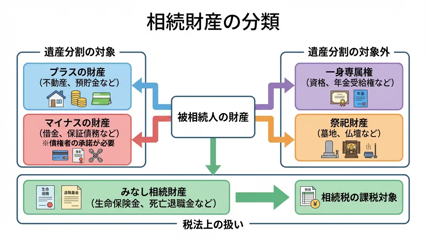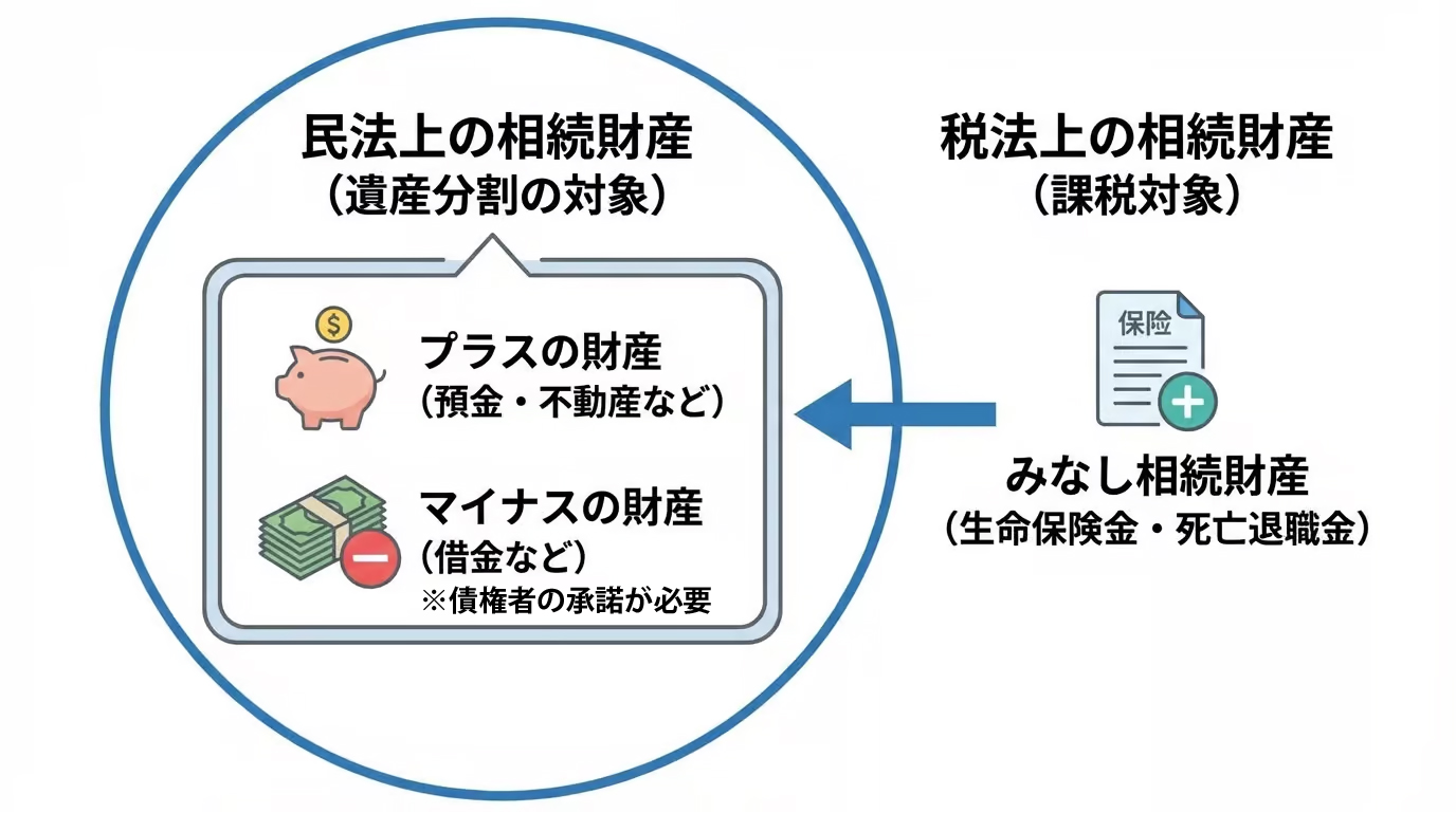 - 相続税の対象(税法上の財産):生命保険金や死亡退職金は、遺産分割の対象外ですが、「みなし相続財産」として相続税の課税対象になります。